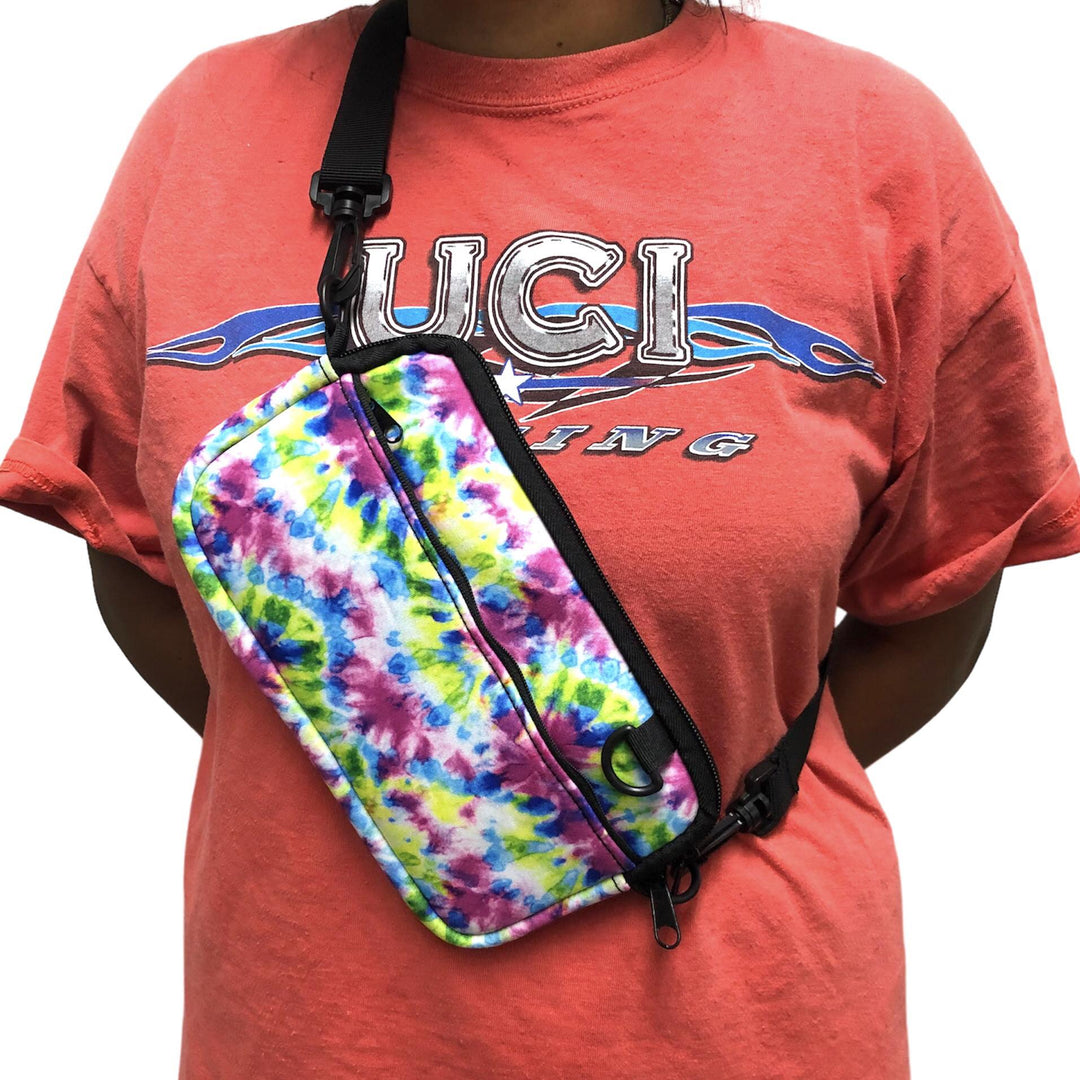 The Purple Tie Dye Cross Body Purse is a stylish and reliable accessory. It is made of 3mm Neoprene and measures 9x5.5 inches.