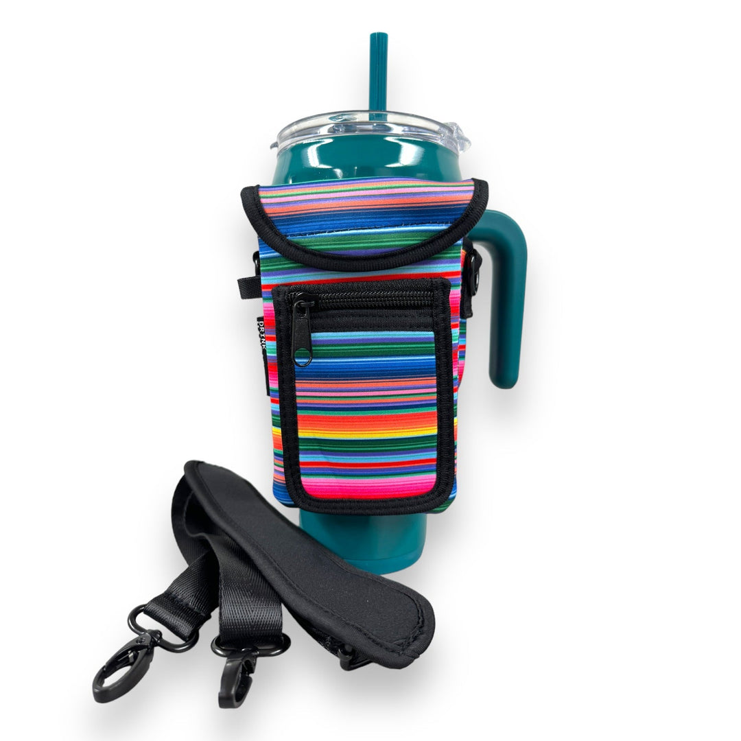 These wrap around pocket Handlers™ have a 6x3.75 pocket that velcro shut and will wrap around bottles and tumblers with a diameter of 3.5 inches to 5 inches. All tumblers pictured are in the 30 - 40 ounce range. They also have a small loop to attach keys.
