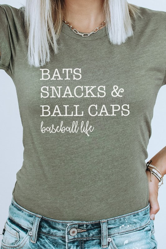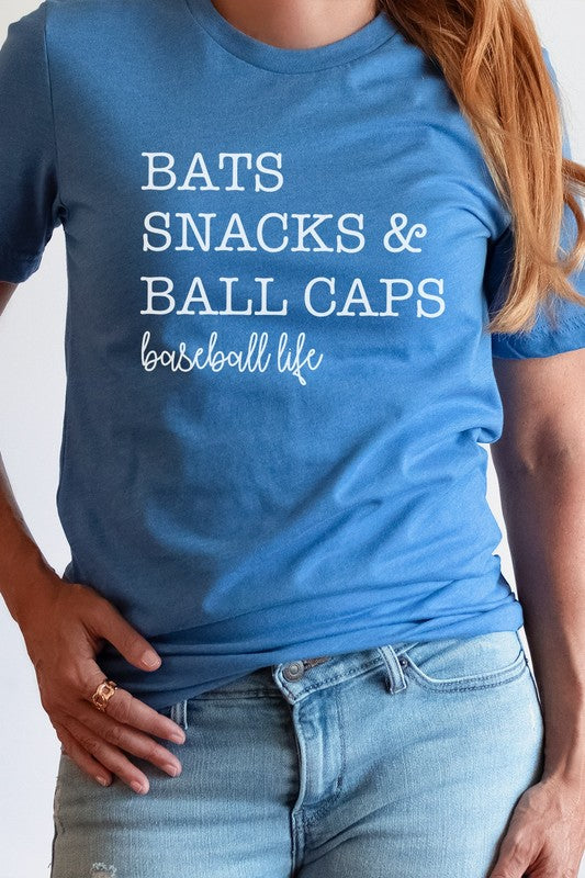 Step up to the plate in our Bats, Snacks, and Ball Caps Baseball Life Graphic Tee! Most t shirt colors are 52/48 cotton/poly blend. White and Cream tees are 100% cotton, Ash tees are 99/1 cotton/poly. The classic fit ensures comfortable wear for all-day play, whether on the field or at the park. Perfect for any baseball enthusiast, this tee is a home run in style and comfort. Score big with our Bats, Snacks, and Ball Caps Baseball Life Graphic Tee. By Kissed Apparel.