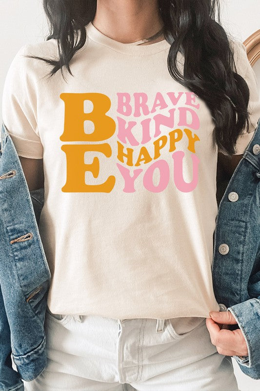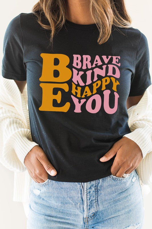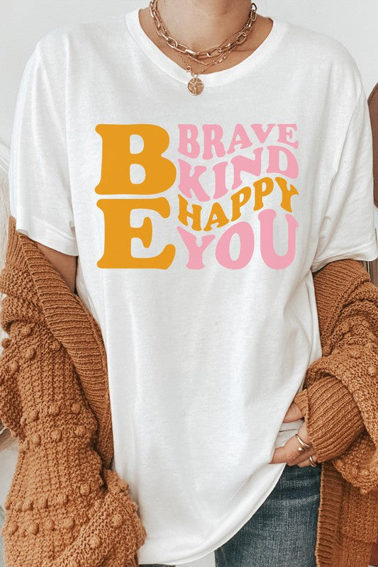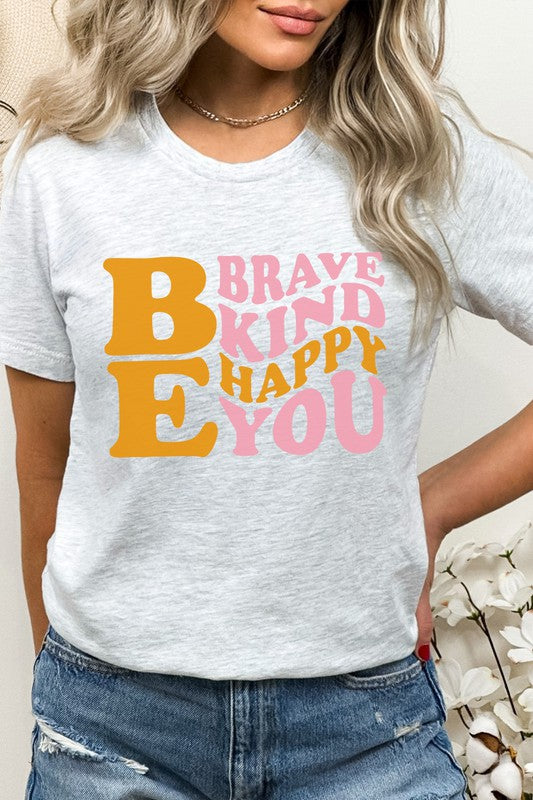 Introducing our "Be Brave Kind Happy Be You" Inspiration Graphic Tee, a positive and empowering choice for your customers. Most t shirt colors are 52/48 cotton/poly blend. White and Cream tees are 100% cotton, Ash tees are 99/1 cotton/poly. Available in various sizes, it's perfect for retailers looking to promote self-confidence and positivity. Inspire your customers to embrace their true selves with our "Be Brave Kind Happy Be You" Inspiration Graphic Tee. By Kissed Apparel.