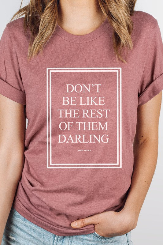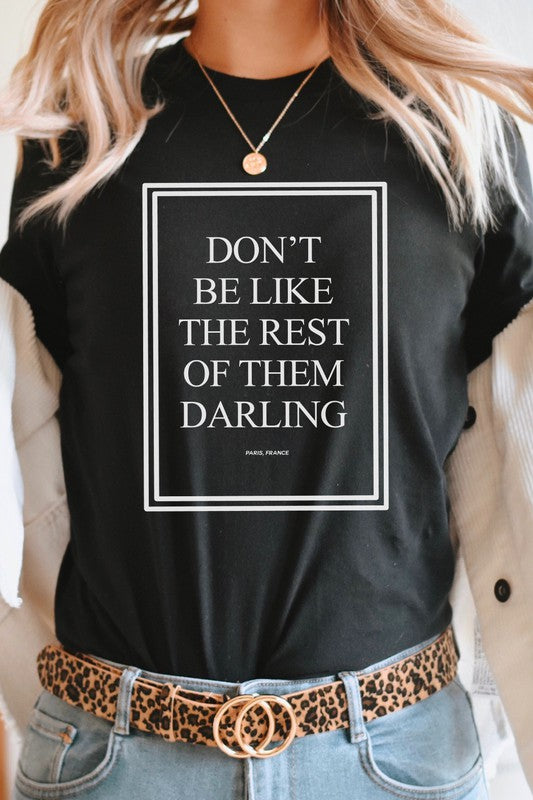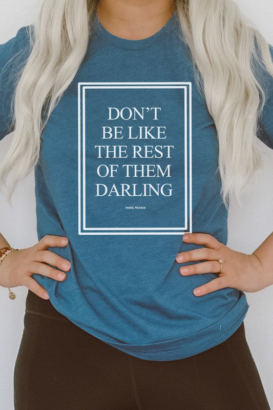 Our "Don't Be Like The Rest Of Them Darling Paris, France" graphic tee is a must-have for anyone who wants to stand out. t-shirt colors are 52/48 cotton/poly blend. This tee features a bold and inspiring message that will motivate you to be true to yourself. With a comfortable fit and stylish design, this tee is perfect for any casual occasion. Get yours today and show the world that you're not afraid to be different! By Kissed Apparel.