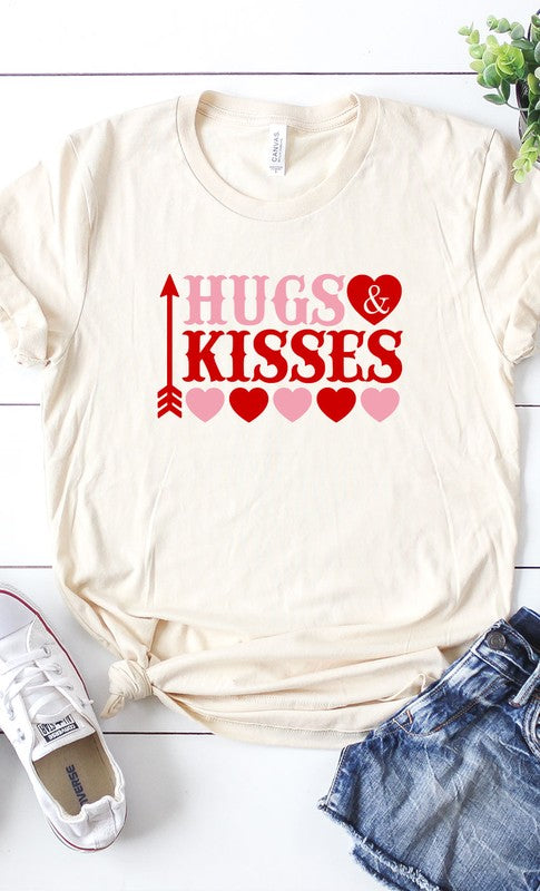 Hugs and Kisses Graphic Tee. Most t-shirt colors are 52/48 Airlume combed and ringspun cotton/polyester, Athletic Heather & Black Heather are 90/10 airlume combed and ringspun cotton/polyester. White, cream, canvas red, lilac, mint are 100% cotton.
