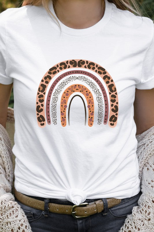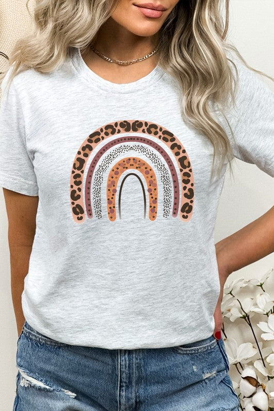 Introducing the Leopard Brown Boho Rainbow Graphic Tee from Kissed Apparel. Elevate your merchandise with this trendy and eye-catching design. Featuring a leopard print boho rainbow, it adds a touch of wild and free-spirited style to any outfit. White and Cream tees are 100% cotton, Ash tees are 99/1 cotton/poly. Peach is 52/48 cotton/poly. Perfect for fashion-forward individuals who love a unique and eclectic look. Order now to captivate customers with this fashionable and versatile tee.