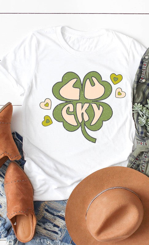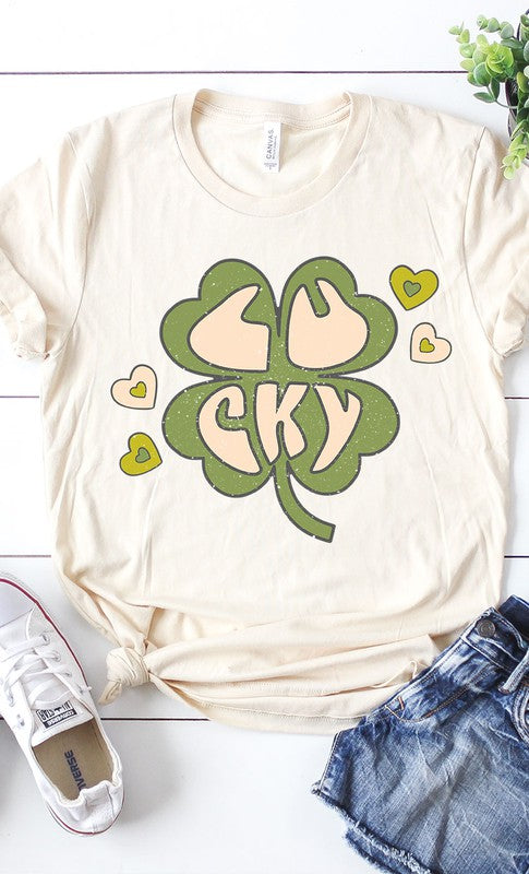 Retro Lucky Clover Graphic Tee PLUS. White and Cream are 100% airlume combed and ringspun cotton, Ash is 99/1 airlume combed and ringspun cotton/polyester