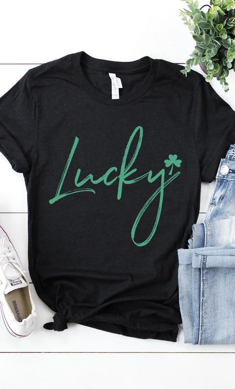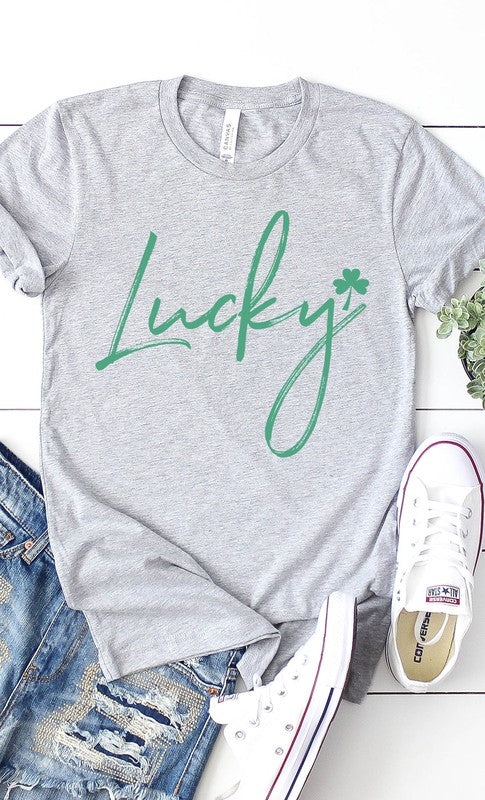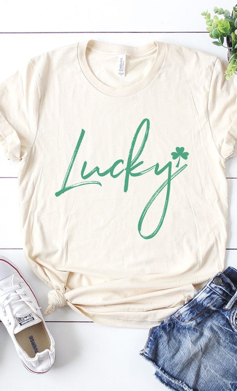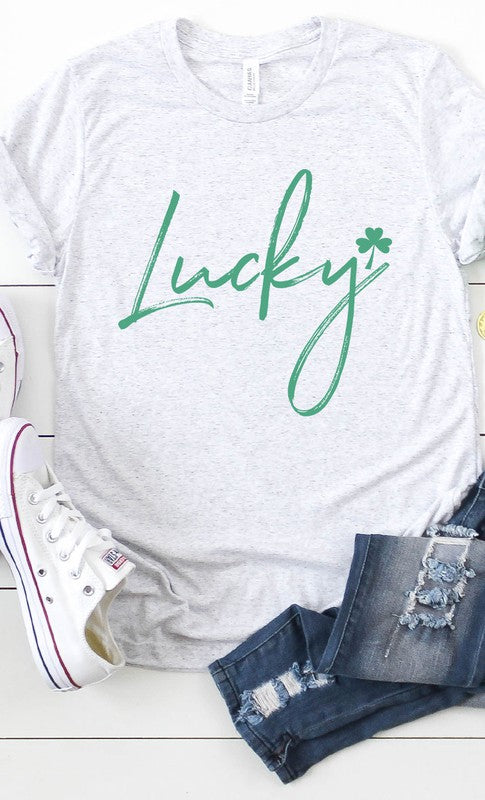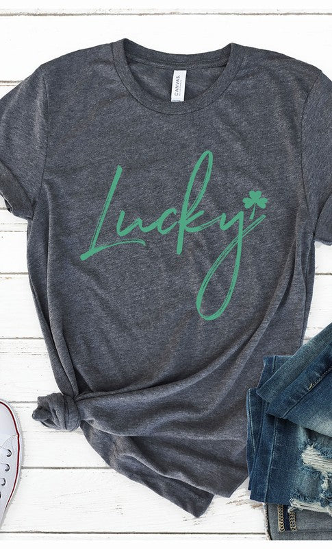 Retro Lucky Graphic Tee. Most t-shirt colors are 52/48 Airlume combed and ringspun cotton/polyester, Athletic Heather & Black Heather are 90/10 airlume combed and ringspun cotton/polyester. White, cream, canvas red, lilac, mint are 100% cotton.