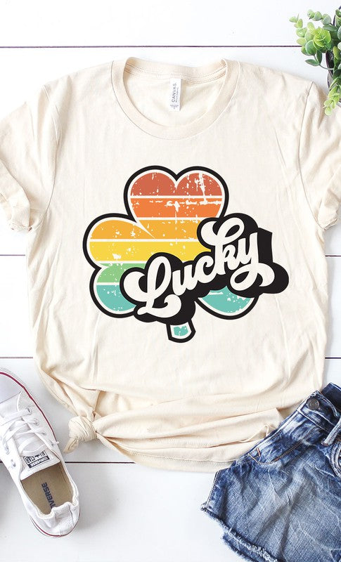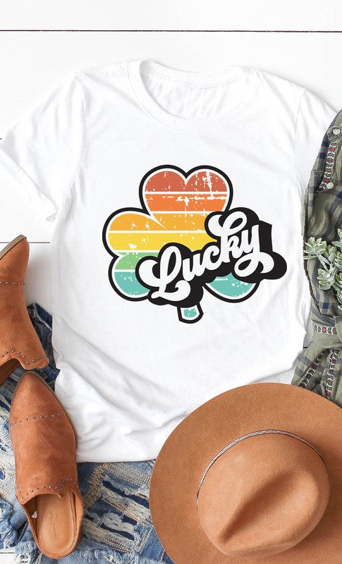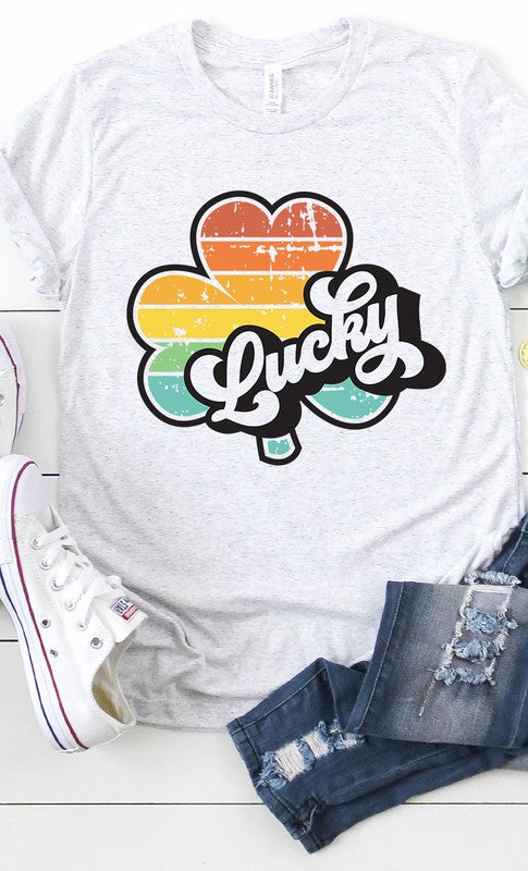 Retro Lucky Rainbow Clover Graphic Tee. White and Cream are 100% airlume combed and ringspun cotton, Ash is 99/1 airlume combed and ringspun cotton/polyester