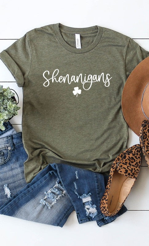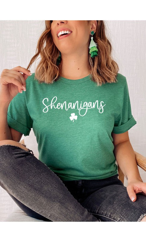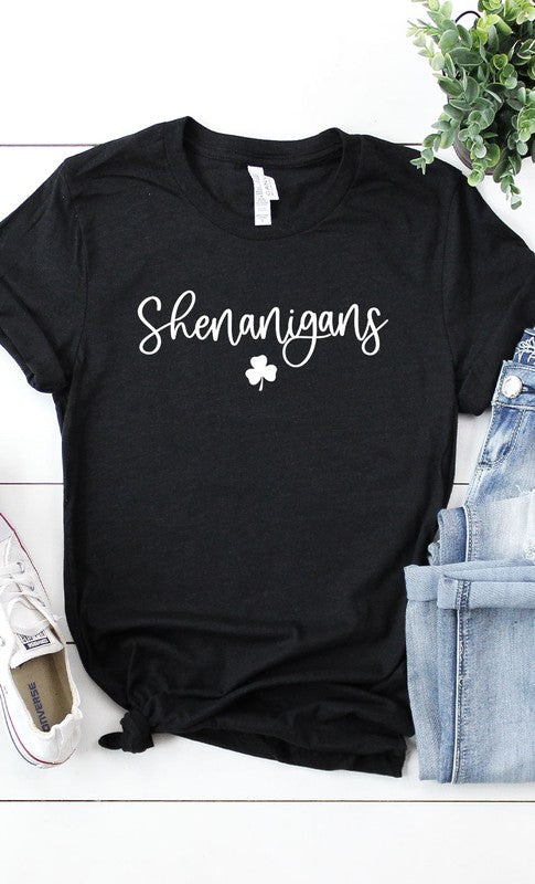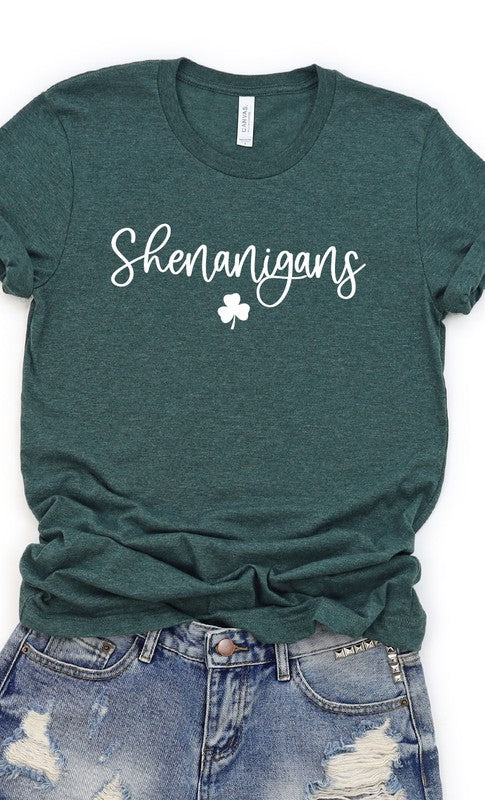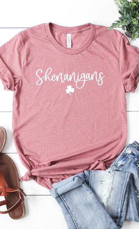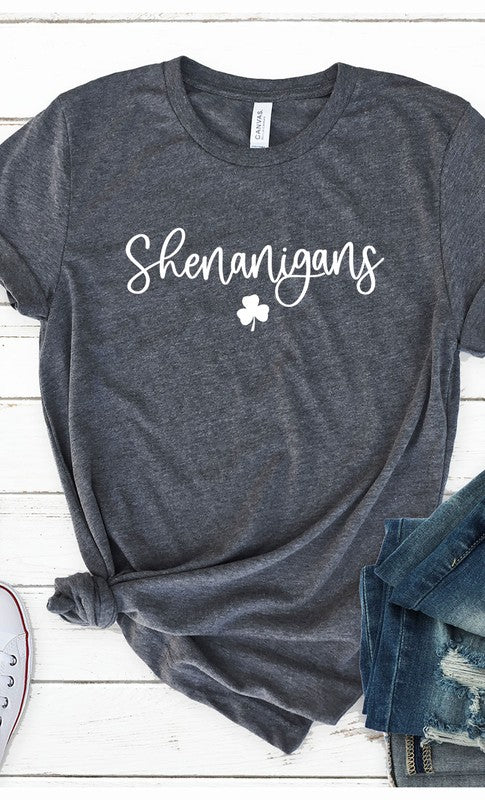 Shenanigans Graphic Tee PLUS. Most t-shirt colors are 52/48 cotton/polyester, Athletic Heather & Black Heather are 90/10 cotton/polyester. White, cream, canvas red, lilac, pink, and mint are 100% cotton. Ash is 99/1.