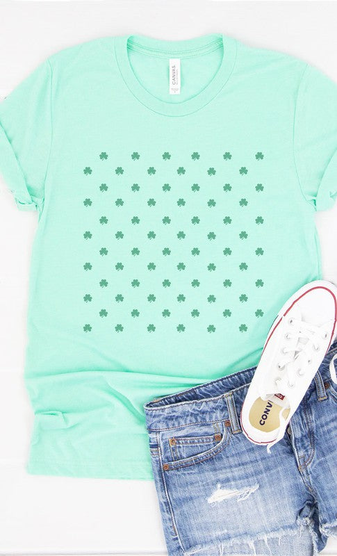 St Patricks Day Shamrock Grid Graphic Tee By Kissed Apparel. Most t-shirt colors are 52/48 cotton/poly blend. White, cream, citron and mint are 100% cotton.